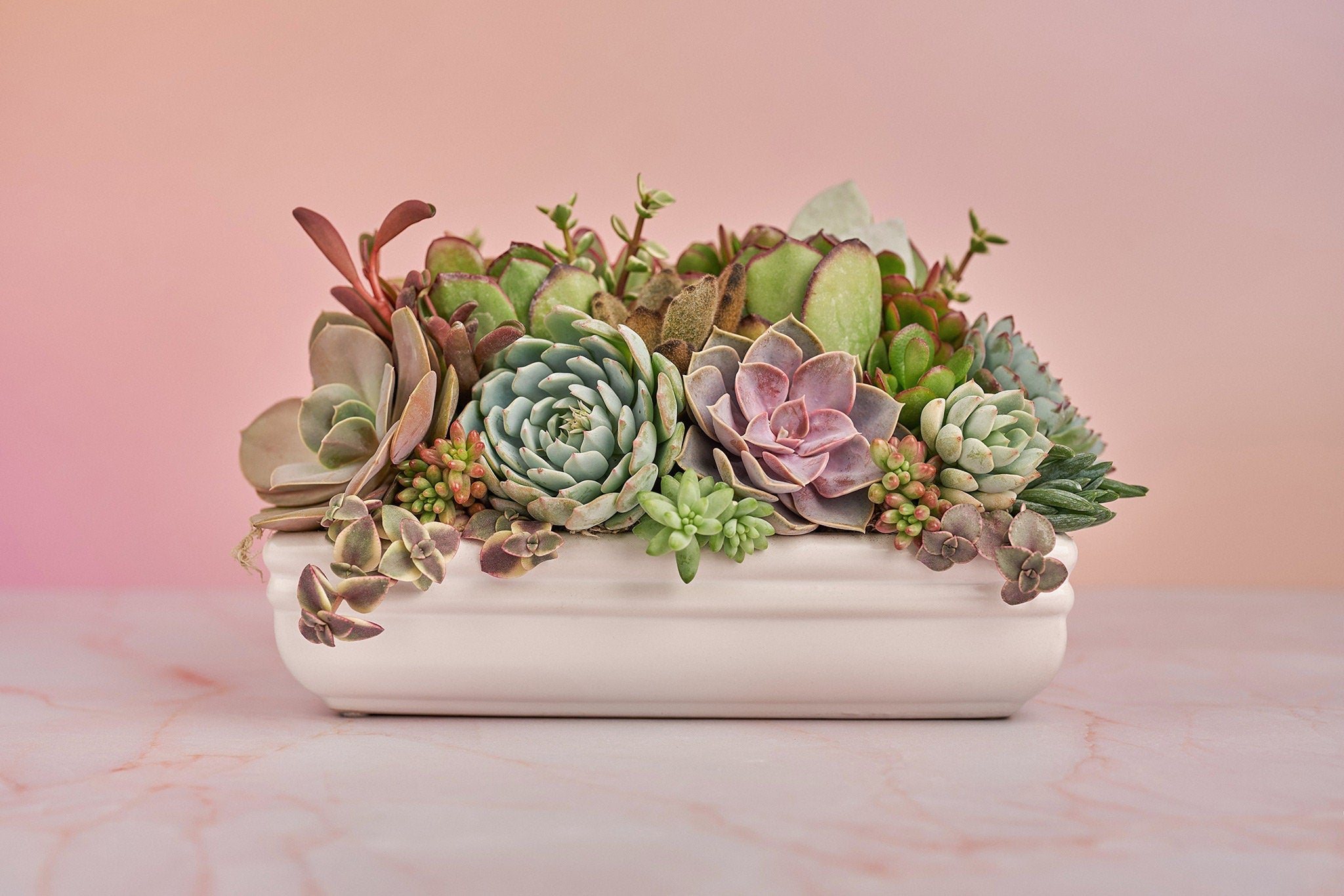 Long White Succulent Arrangement Planter